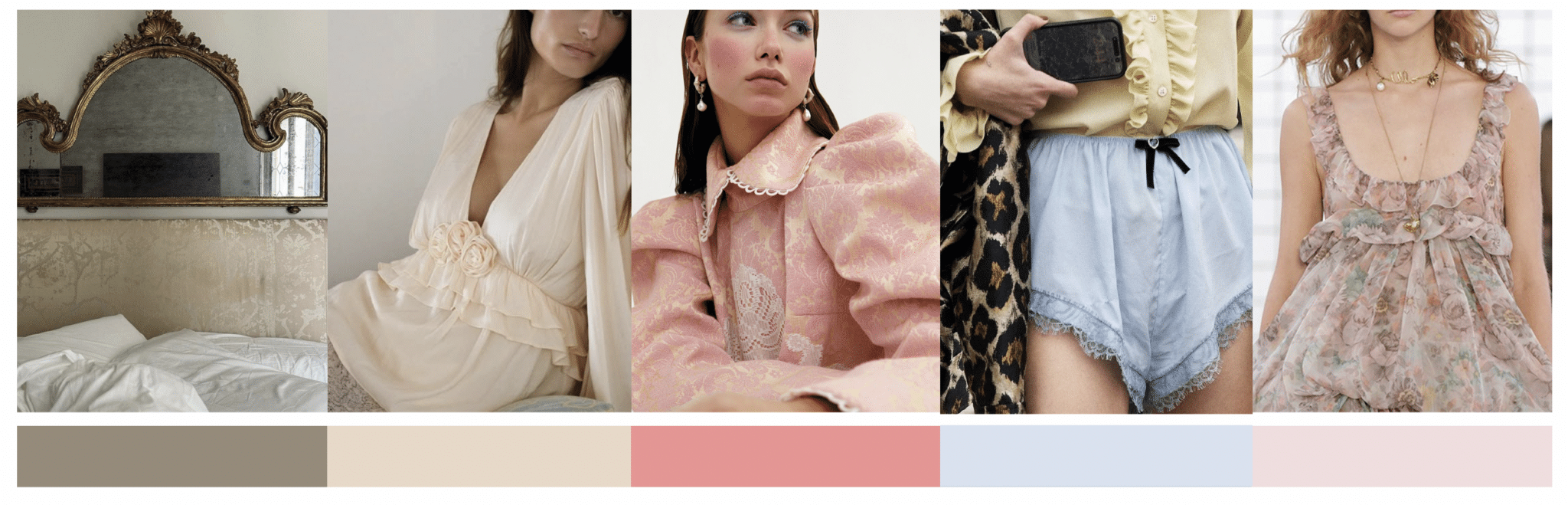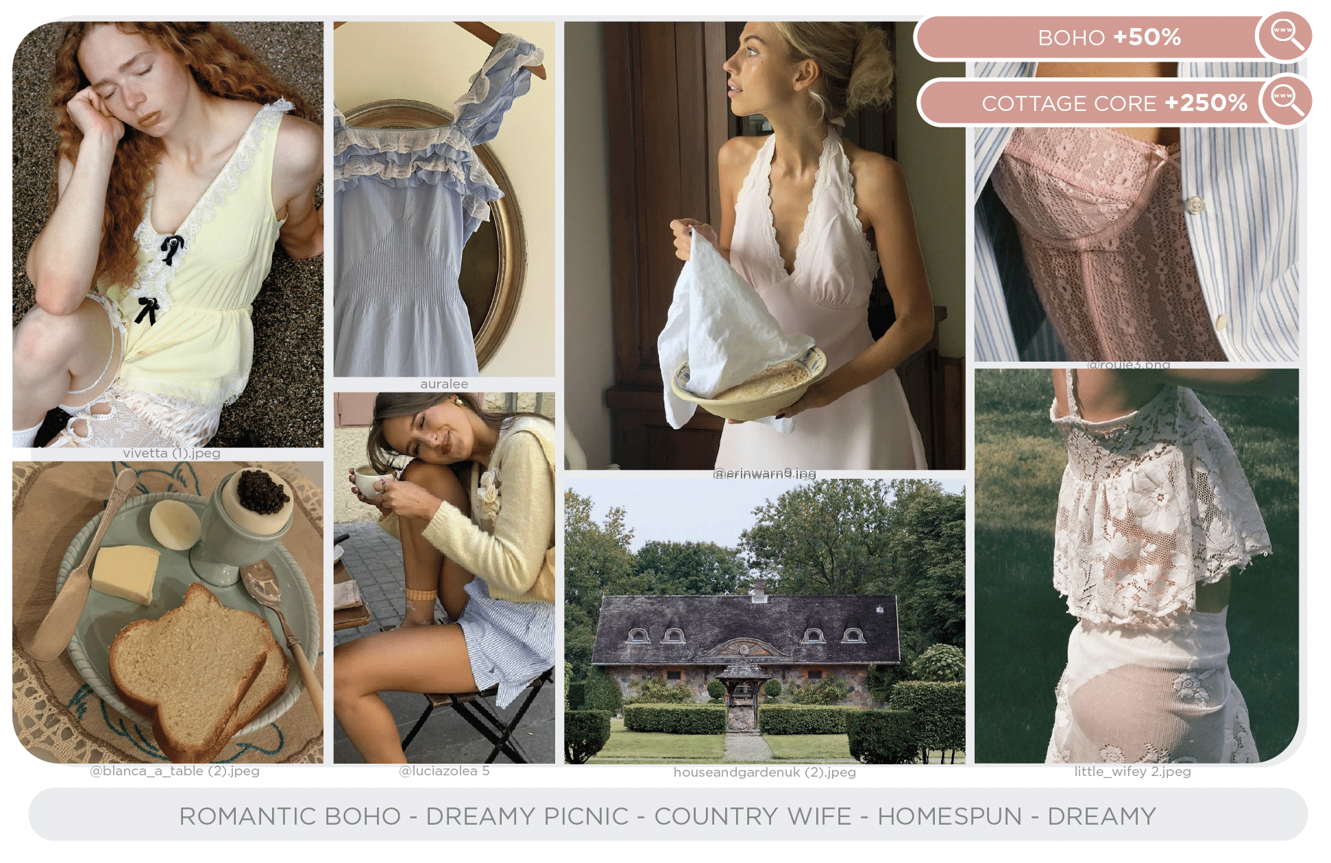 Meadow Moments . This trend captures a serene escape into a pastel-hued countryside, blending soft country boho vibes with a dainty, bucolic take on #coquettecore. It reflects a yearning for simplicity and nostalgia, reviving past traditions and embracing the charm of rural living. Summer days flow by in a romantic, dreamy atmosphere, inviting slow wanderings through meadows and gardens, where new possibilities unfold with gentle naivety. The pastel palette—featuring rosy tones of dawn and poetic soft neutrals—enhances this tranquil mood. Iconic pieces include flowing dresses so light they drape the silhouette like a veil, corset-inspired tops that merge vintage romance with modern versatility, and ruffled blouses adorned with delicate lace details. Refined finishes amplify the timeless aesthetic, while lace and lightweight cottons create a harmonious interplay with tapestry-like floral prints and iconic gingham patterns. This dreamy trend celebrates a tradwife moment, reimagining the pastoral lifestyle with coquette charm and a bohemian edge—a perfect fusion of vintage femininity and contemporary simplicity.
