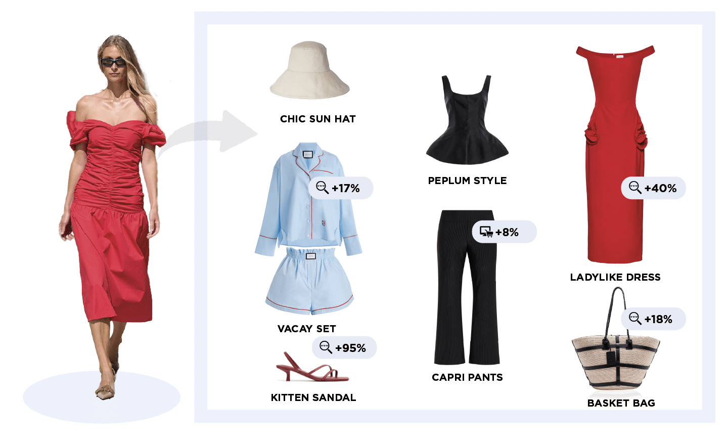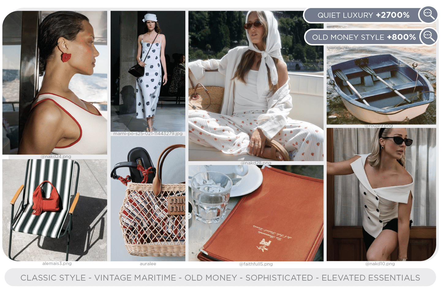 Supreme Maritime. This trend is a seamless blend of old-money aesthetics and quiet luxury, evoking the charm of an idyllic coastal summer. It tells a story of yacht-ready sophistication and timeless summer elegance, effortlessly balancing classic nautical inspiration with contemporary refinement. This trend thrives on a neutral palette dominated by crisp whites, inky blacks, rich reds, deep blues, and velvety navies—colors that exude a polished yet breezy charm. The silhouette emphasizes ladylike femininity, favoring pencil skirts, A-line dresses, and matching tailored sets that feel both structured and relaxed. Boat necklines add an air of understated grace, while Breton stripes—a hallmark of coastal style—anchor the look with timeless sophistication. Accessories play a key role in the Supreme Maritime story. Kitten heels lend a subtle lift without sacrificing comfort, while basket bags add a touch of casual, beach-club elegance. The result is a wardrobe that transitions effortlessly from seaside lounging to upscale summer soirées. Perfect for evoking the quiet luxury of summer by the sea, the Supreme Maritime trend embodies a breezy, polished lifestyle that feels as relevant at a yacht club as it does during a sunlit stroll along the coast. It’s classic, sophisticated, and eternally chic.